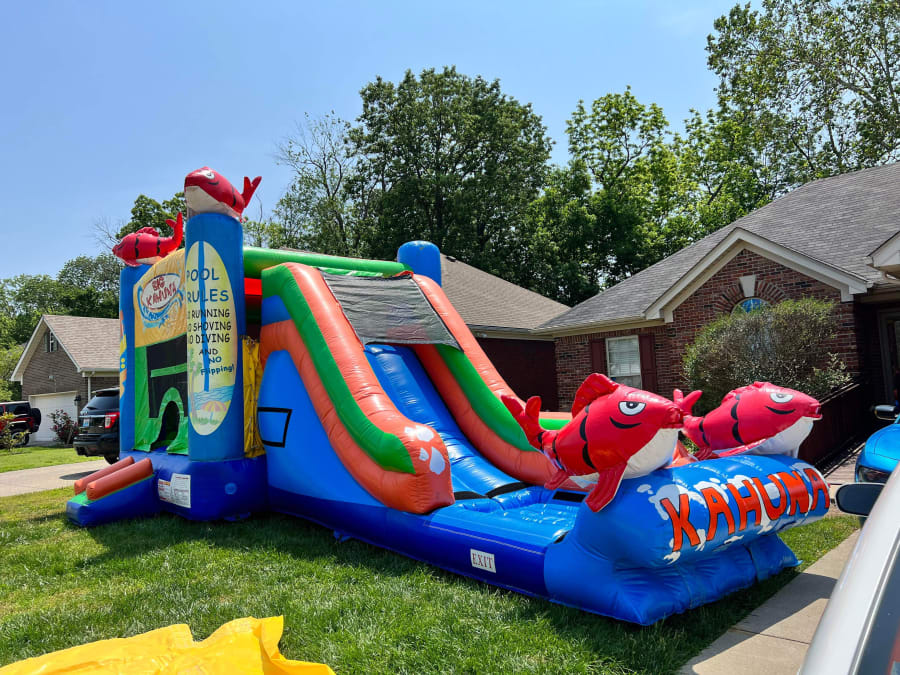 Here at Buddys Bouncys our combos have all the fun of a larger combo without the size! Complete with a roomy jumping area, basketball hoop and slide, our combos are the perfect compact inflatable for maximum entertainment. The Big kahuna fish combo is a perfect unit to use inside or outside, and has flashy colors that’s sure to draw a crowd!