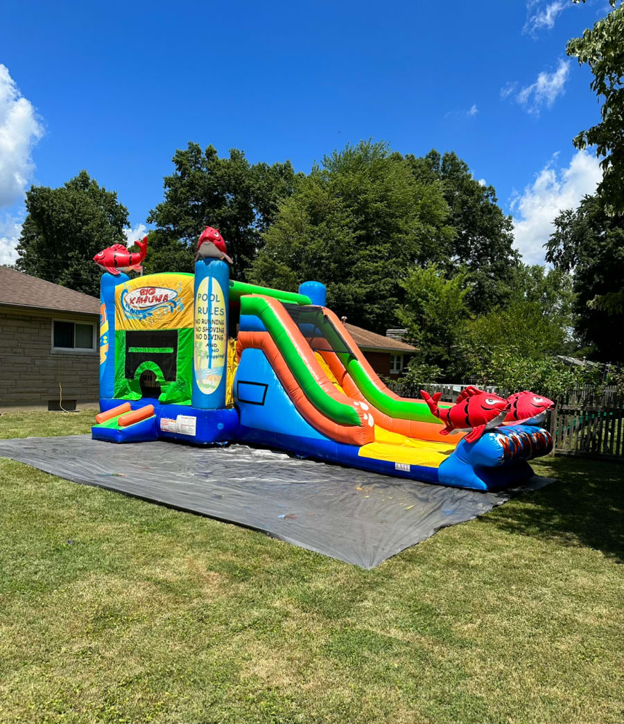 Here at Buddys Bouncys our combos have all the fun of a larger combo without the size! Complete with a roomy jumping area, basketball hoop and slide, our combos are the perfect compact inflatable for maximum entertainment. The Big kahuna (fish) combo is a perfect unit to use inside or outside, and has flashy colors that’s sure to draw a crowd!